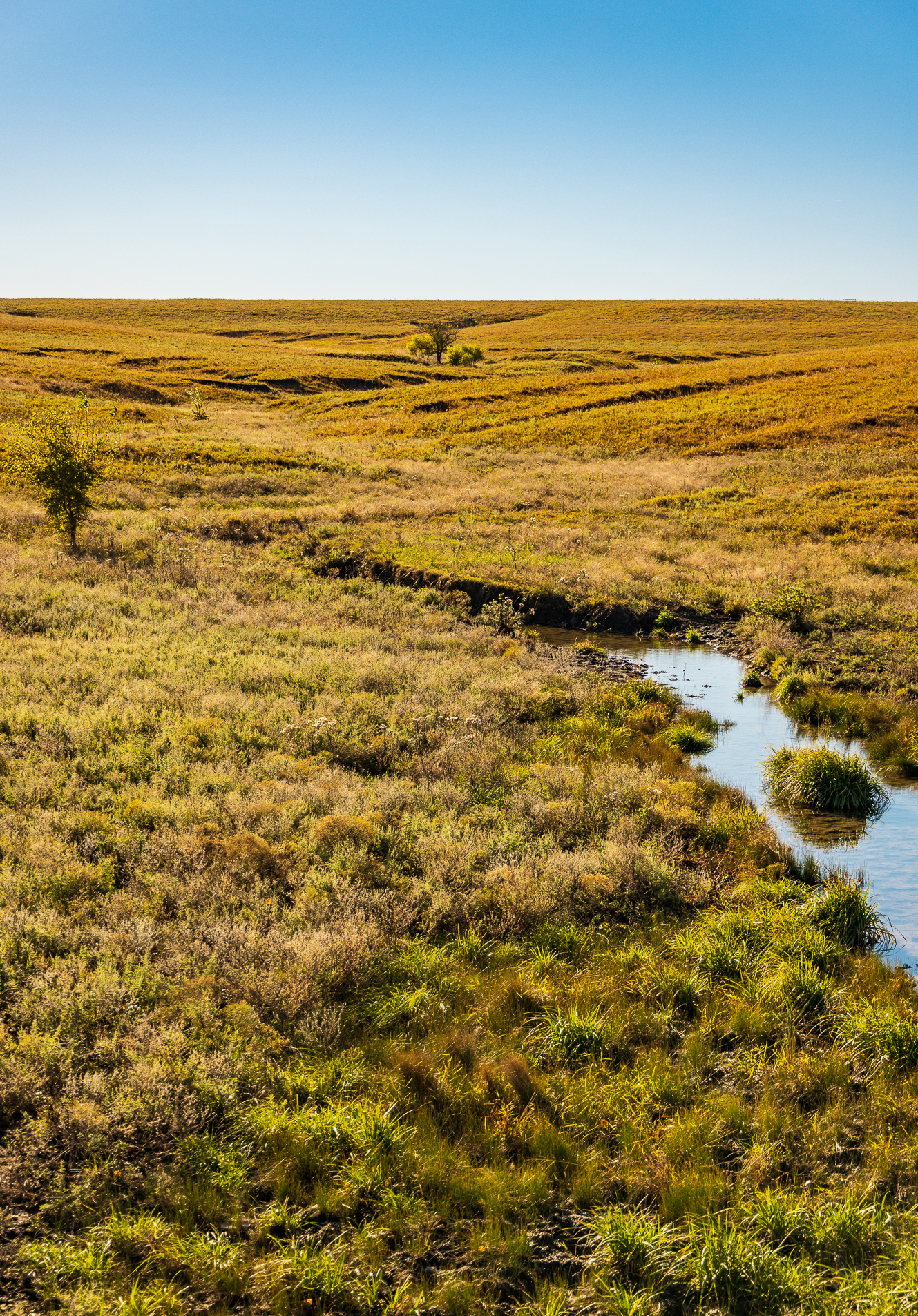 A creek trickles down a gentle slope in the Flint Hills area of Kansas