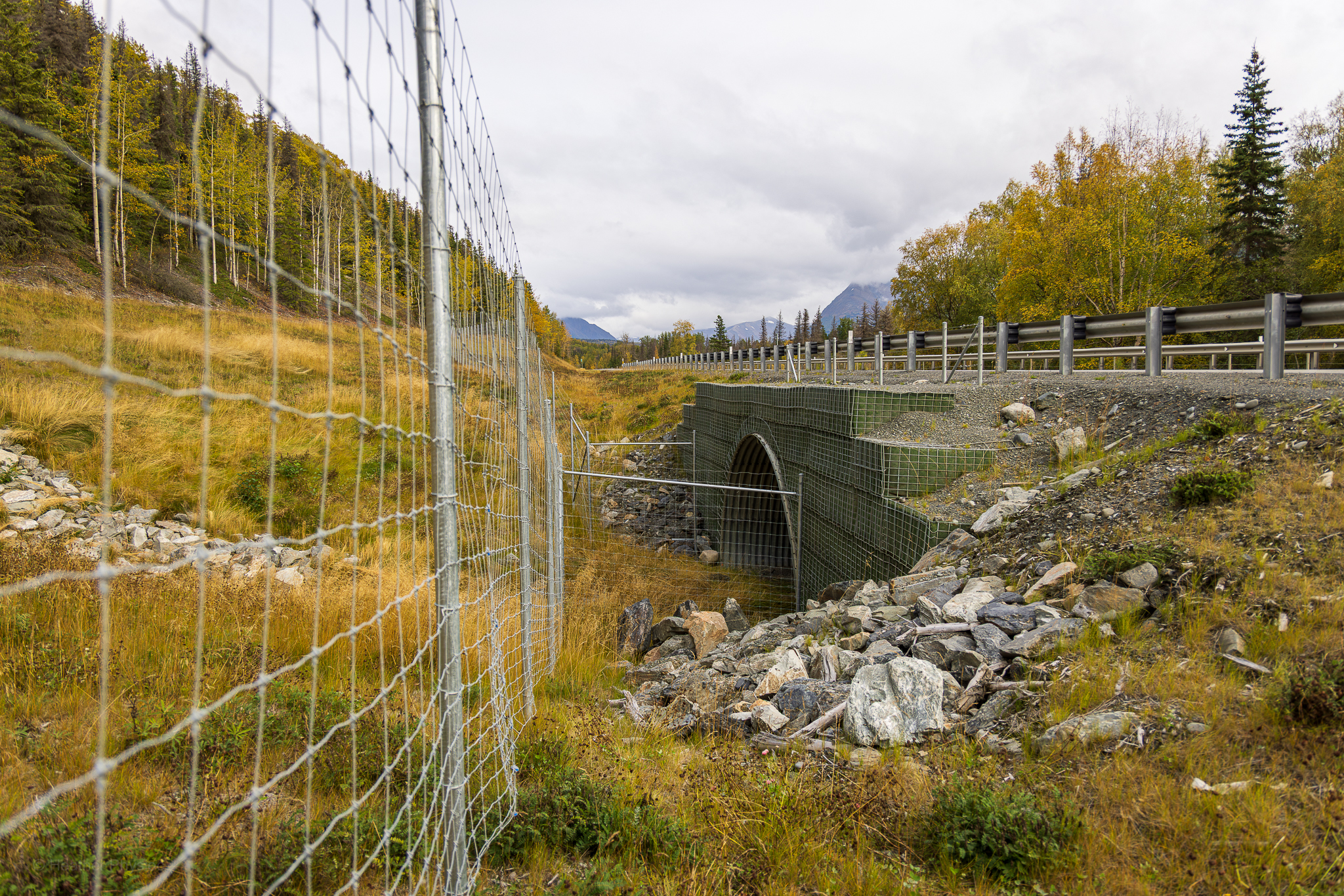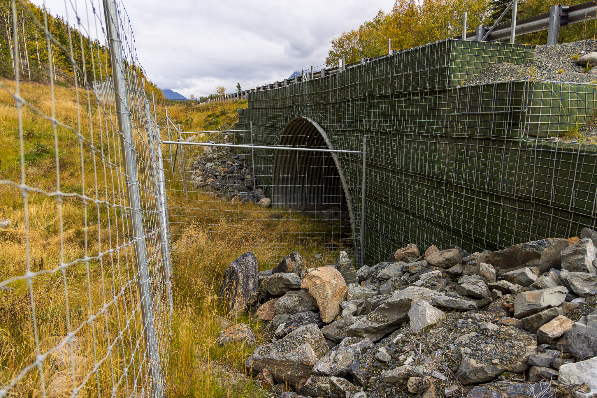 I spotted the grid-like fencing behind the guard rails, and pulled the car to the side of the road, flipping on my flashers. The fence lining the Sterling Highway starts at about one foot off the ground to allow smaller animals to pass underneath, and reaches eight feet tall to keep out animals like deer and moose. It features seven-foot vertical drops at “jump-out” points every eighth of a mile, crucial for preventing bear and moose from returning to the corridor. I walked down the embankment along the fence line until the fencing makes a 90-degree bend and connects to a cylindrical culvert, surrounded by large boulders.
